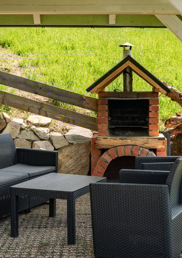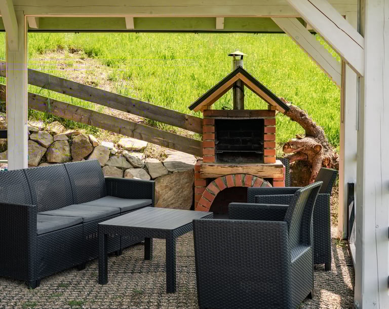 zadaszony taras z grillem i meblami ogrodowymi,